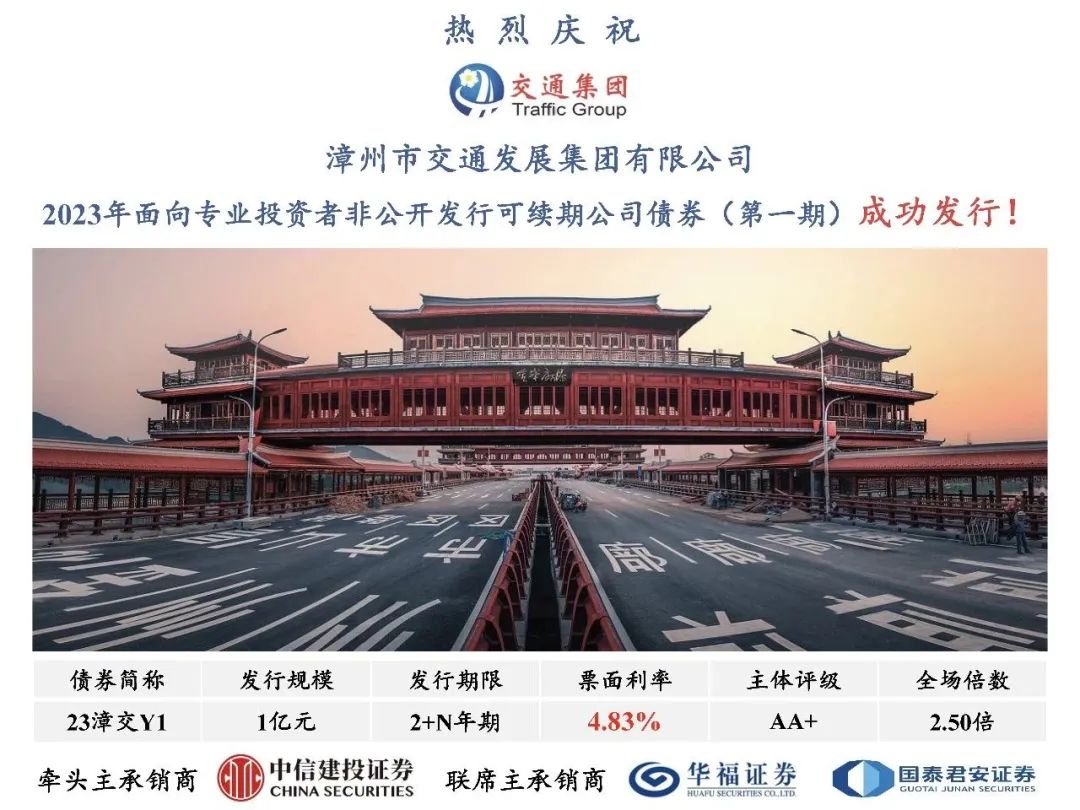 2月27日,漳州市交通發(fā)展集團有限公司2023年面向?qū)I(yè)投資者非公開發(fā)行可續(xù)期公司債券(第一期)簿記發(fā)行,由中信建投證券擔(dān)任牽頭主承銷商,華福證券和國泰君安證券擔(dān)任聯(lián)席主承銷商,發(fā)行規(guī)模1億元,期限2+N年期,票面利率4.83%,全場認(rèn)購倍數(shù)2.50倍。