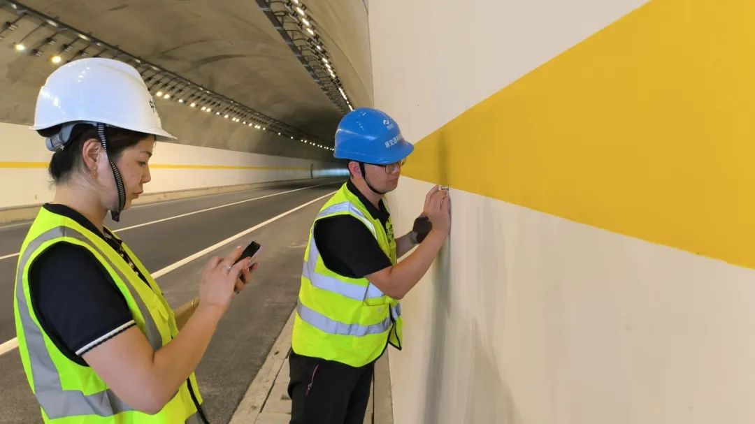 本次質(zhì)量抽檢嚴(yán)格執(zhí)行省交通運(yùn)輸廳關(guān)于推進(jìn)實(shí)施公路隧道洞壁亮化的有關(guān)標(biāo)準(zhǔn)要求,重點(diǎn)對粘結(jié)力、漫反射率、涂裝層厚度等三項(xiàng)指標(biāo)進(jìn)行實(shí)體抽檢。專業(yè)化的檢測人員和設(shè)備為此次質(zhì)量抽檢工作提供技術(shù)支持和指導(dǎo),抽檢工作順利完成。