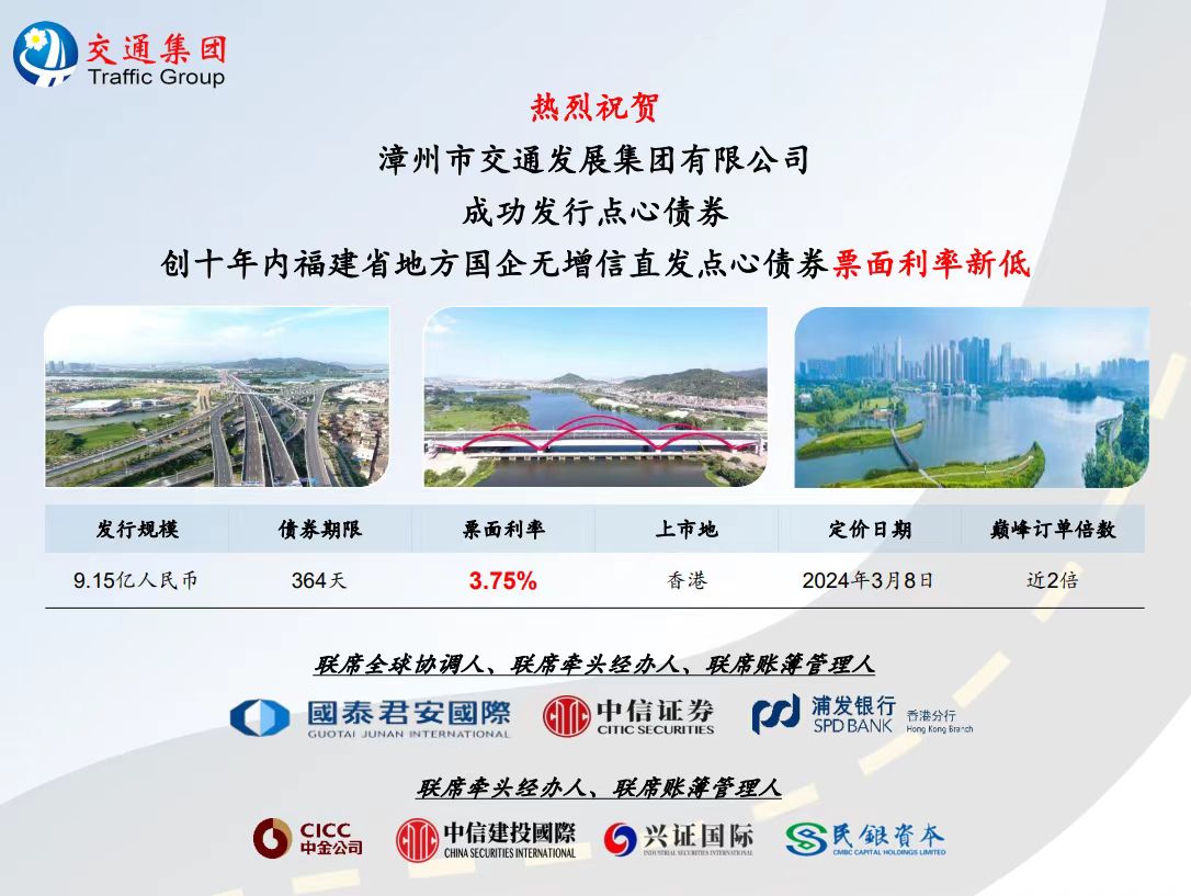 漳州交通集團積極響應(yīng)國家省市政策號召,不斷健全融資風(fēng)險防控機制,拓寬融資渠道,完善融資模式,持續(xù)穩(wěn)健探索國內(nèi)國際資本市場。本次境外債券項目自啟動以來,在集團與全球協(xié)調(diào)人國泰君安國際、中信里昂證券的共同努力下,各方高效聯(lián)動,迅速落實發(fā)行前的各項準(zhǔn)備工作,通過對當(dāng)前市場的合理研判,精準(zhǔn)把握了市場窗口。同時,項目團隊積極推動銷售工作,夯實投資訂單,最終獲得了境內(nèi)外超過25位知名市場投資人的大力支持,本次點心債券發(fā)行工作圓滿完成。
