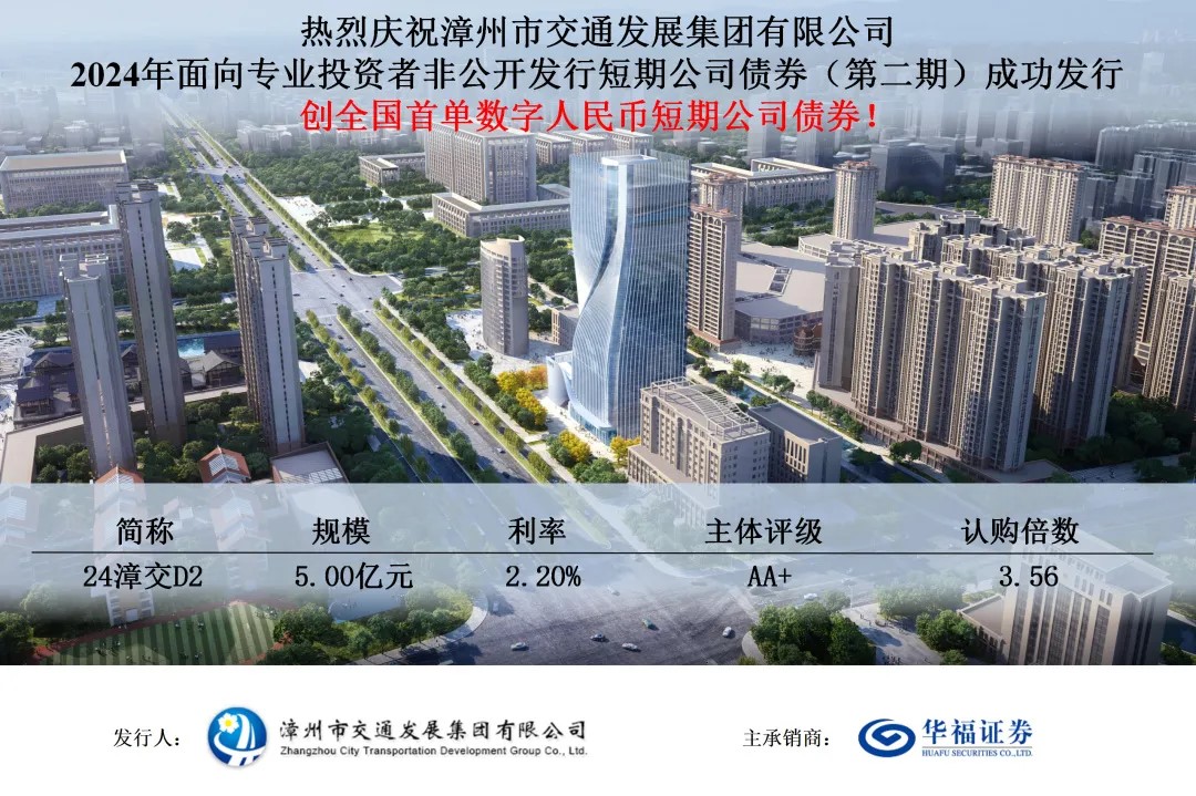 8月29日,漳州市交通發(fā)展集團有限公司成功發(fā)行漳州市交通發(fā)展集團有限公司2024年面向專業(yè)投資者非公開發(fā)行短期公司債券(第二期)。本期債券為全國首單數(shù)字人民幣短期公司債券,發(fā)行規(guī)模為5億元,債券期限為1年,主體評級為AA+,由華福證券擔任獨家主承銷商,發(fā)行利率為2.20%,全場認購倍數(shù)達3.56倍。