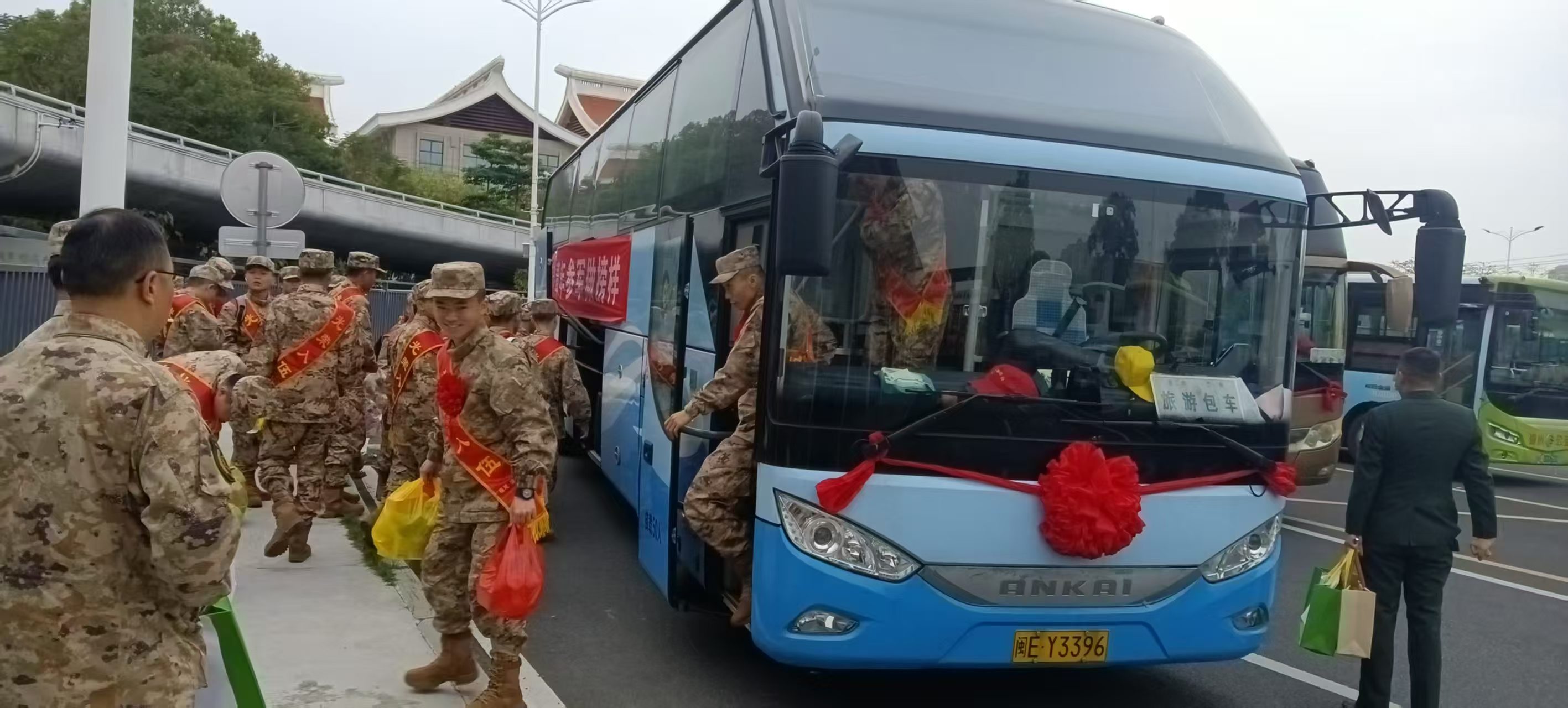 ????旅游車和公交車身上鮮艷的紅花格外引人注目,象征著對每一位新兵的祝福與崇高敬意。車外的標語更是激勵著這些年輕的心靈,讓他們在即將開啟新征程途中倍感振奮?! ?/P>