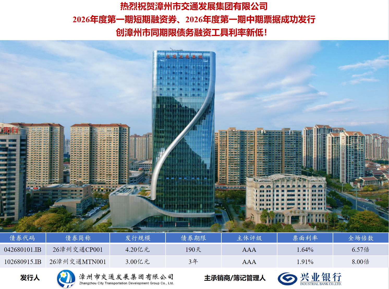 其中,短期融資券發(fā)行期限190天,票面利率1.64%,較公司上筆同品種債券利率下降25個基點(diǎn),全場認(rèn)購倍數(shù)達(dá)6.57倍;中期票據(jù)發(fā)行期限3年,票面利率1.91%,較公司上筆同品種債券利率下降12個基點(diǎn),全場認(rèn)購倍數(shù)達(dá)8.00倍。本期債券發(fā)行利率雙雙創(chuàng)下漳州市同品種債券歷史新低!